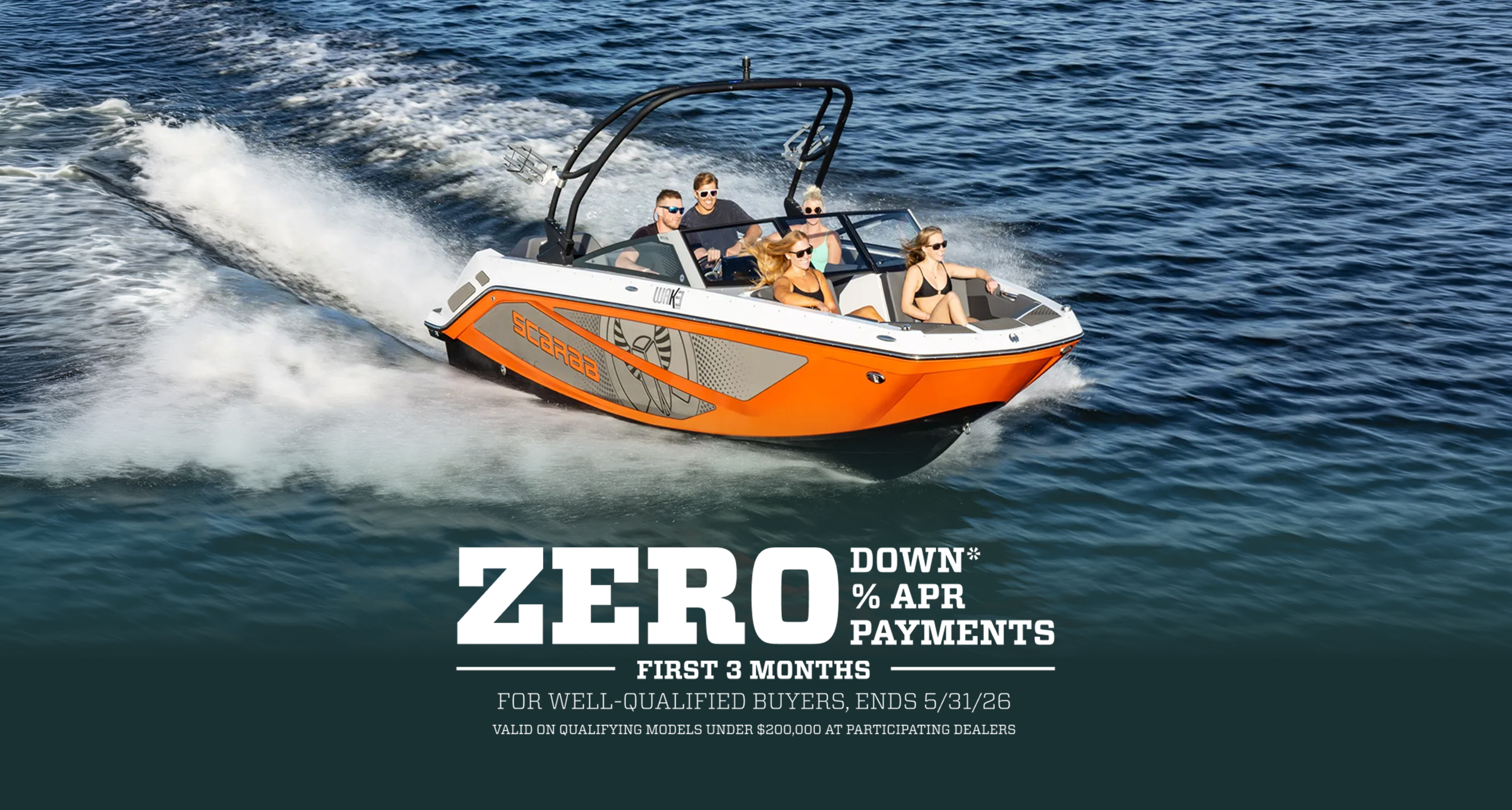 *Valid on qualifying Scarab Jet Boats under $200,000. Financing through Sheffield Financial on approved credit (Tier 1–2, 760+). 120-month term; 8.99% APR after promotional period. $150 origination fee. Offer expires May 31, 2026. Terms and conditions apply.